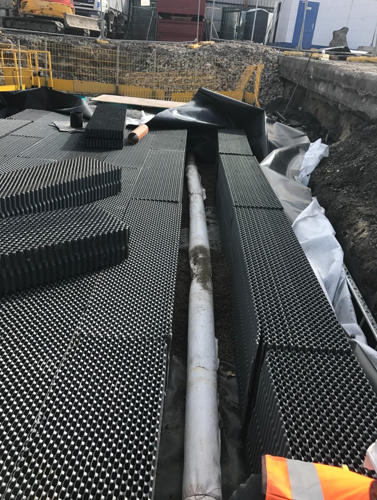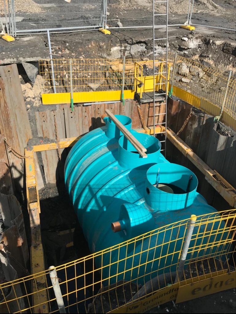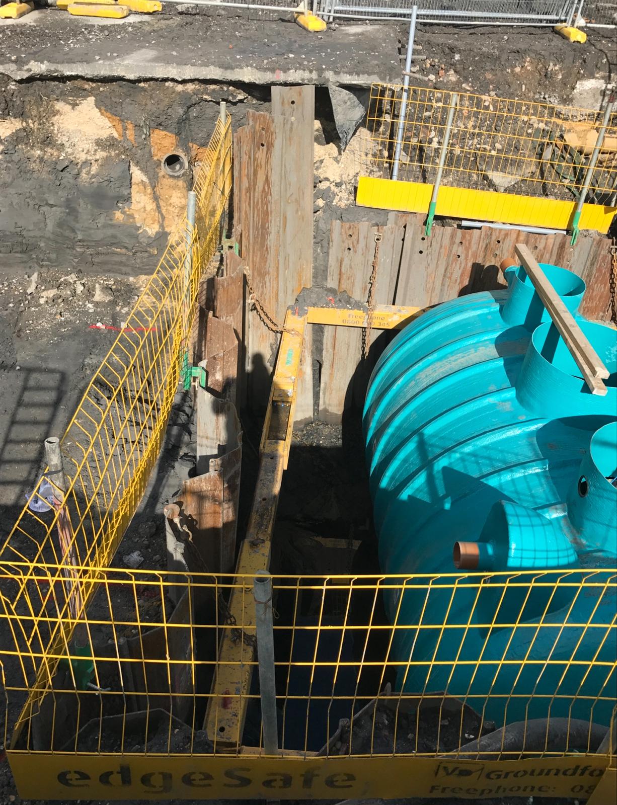 This project in Dartford involved the installation of an advanced stormwater management and drainage system designed to improve site water control and ensure long-term stability. The works began with deep excavation supported by sheet piling and edge protection to create a safe working environment. A large underground storage tank was installed to manage stormwater efficiently, complemented by a robust backfilling process to secure the structure. Following the tank installation, a modular stormwater attenuation system was assembled, incorporating high-capacity crate systems and protective geotextile membranes. These components were carefully connected to the main drainage lines, ensuring seamless integration with the site’s overall water management plan. The project demonstrates a commitment to precision engineering, safety, and sustainability, delivering a drainage solution that supports both environmental standards and future site operations.